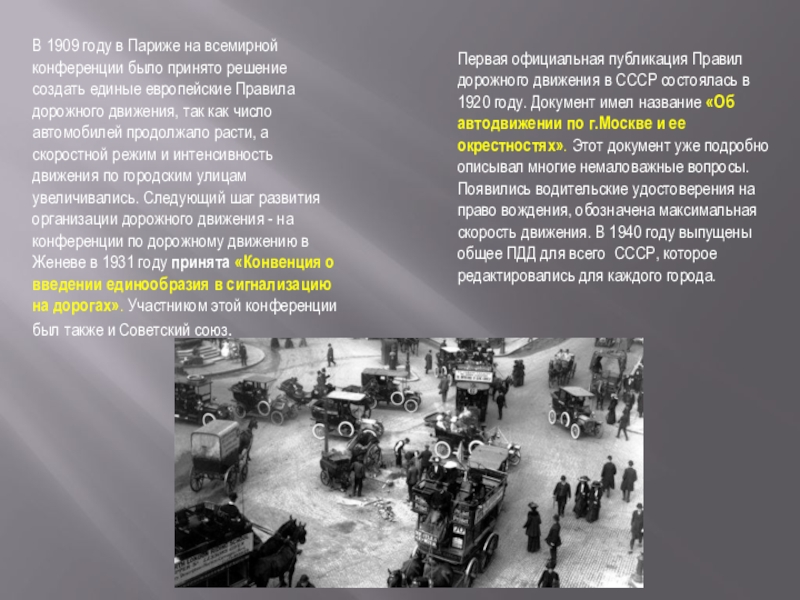 Первая официальная публикация Правил дорожного движения в СССР состоялась в 1920 году. Документ имел название «Об автодвижении по г.Москве и ее окрестностях». Этот документ уже подробно описывал многие немаловажные вопросы. Появились водительские удостоверения на право вождения, обозначена максимальная скорость движения. В 1940 году выпущены общее ПДД для всего СССР, которое редактировались для каждого города.