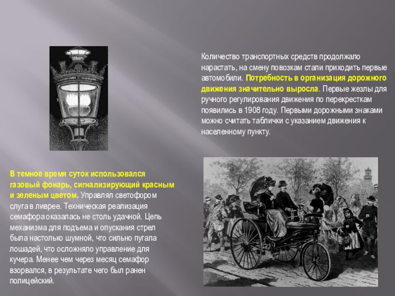 Количество транспортных средств продолжало нарастать, на смену повозкам стали приходить первые автомобили. Потребность в организация дорожного движения значительно выросла. Первые жезлы для ручного регулирования движения по перекресткам появились в 1908 году. Первыми дорожными знаками можно считать таблички с указанием движения к населенному пункту.