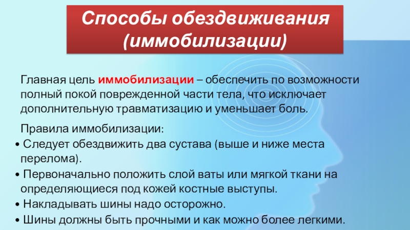 Способы обездвиживания (иммобилизации)Главная цель иммобилизации – обеспечить по возможности полный покой поврежденной части тела, что исключает дополнительную