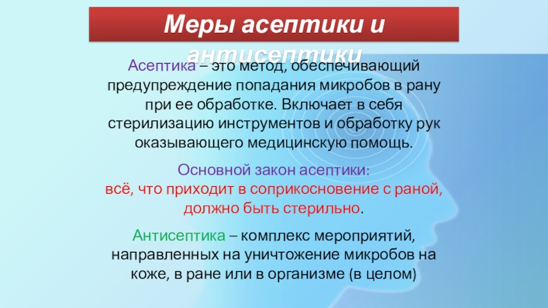Меры асептики и антисептикиАсептика – это метод, обеспечивающий предупреждение попадания микробов в рану при ее обработке. Включает