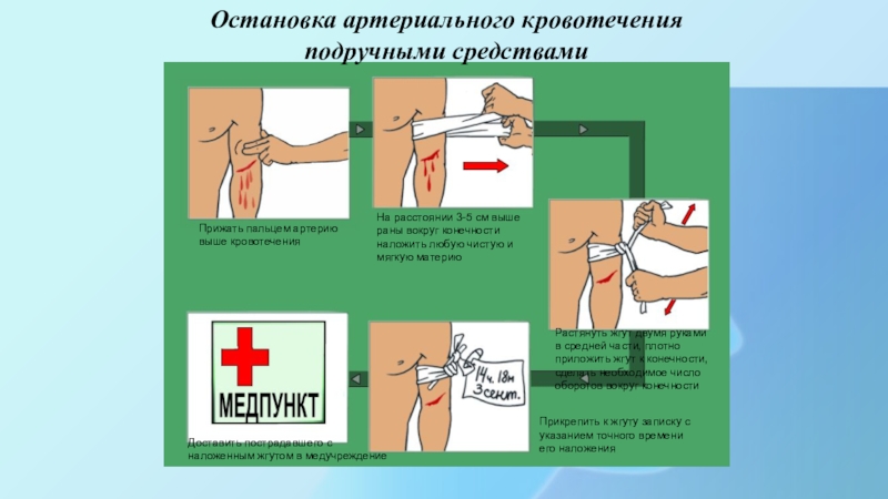 Слайд 9Остановка артериального кровотечения подручными средствами