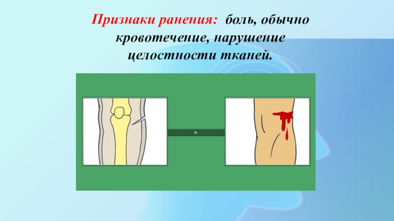 Слайд 7Признаки ранения: боль, обычно кровотечение, нарушение целостности тканей.