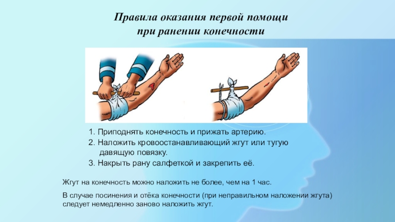 Слайд 13Правила оказания первой помощи при ранении конечности