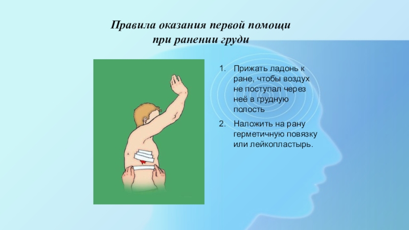 Правила оказания первой помощи при ранении грудиПрижать ладонь к ране, чтобы воздух не поступал через неё в