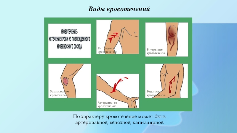 Виды кровотеченийАртериальное кровотечениеВенозное кровотечение Внутреннее кровотечение Капиллярное кровотечение Наружное кровотечение По характеру кровотечение может быть: артериальное; венозное;