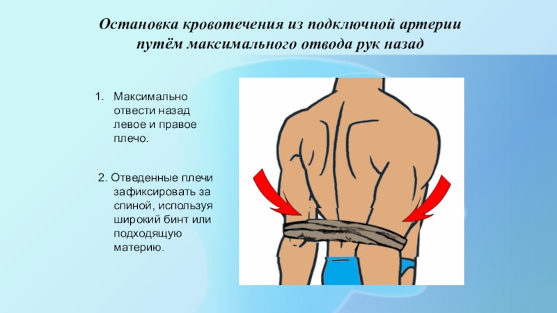 Слайд 12Остановка кровотечения из подключной артерии путём максимального отвода рук назад