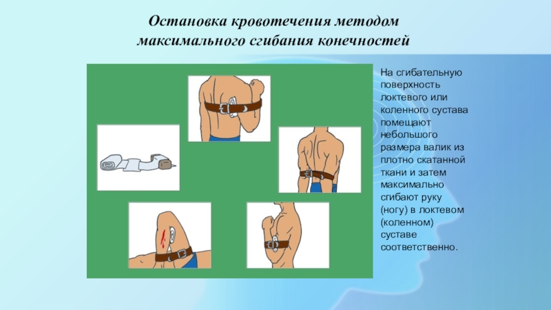 Остановка кровотечения методом максимального сгибания конечностейНа сгибательную поверхность локтевого или коленного сустава помещают небольшого размера валик из