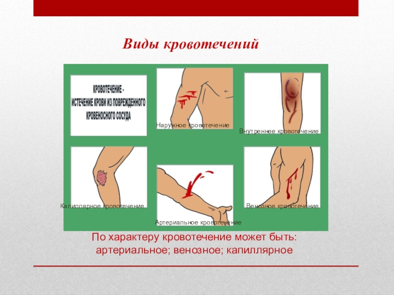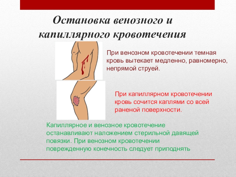 Капиллярное и венозное кровотечение останавливают наложением стерильной давящей повязки. При венозном кровотечении поврежденную конечность следует приподнять
