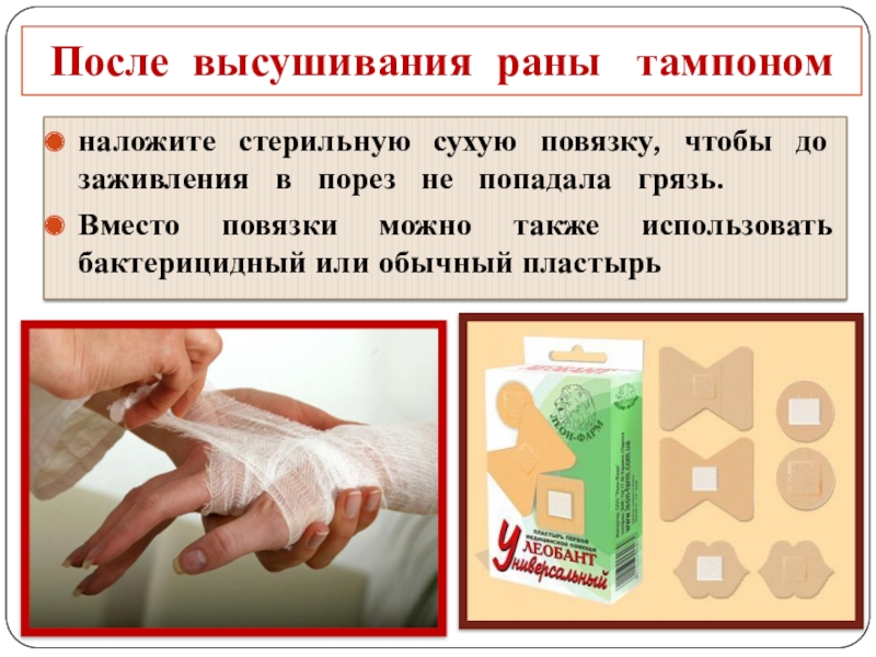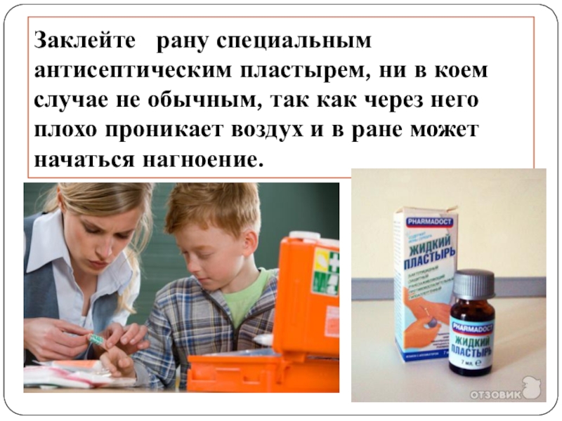 Слайд 20Заклейте рану специальным антисептическим пластырем, ни в коем случае не