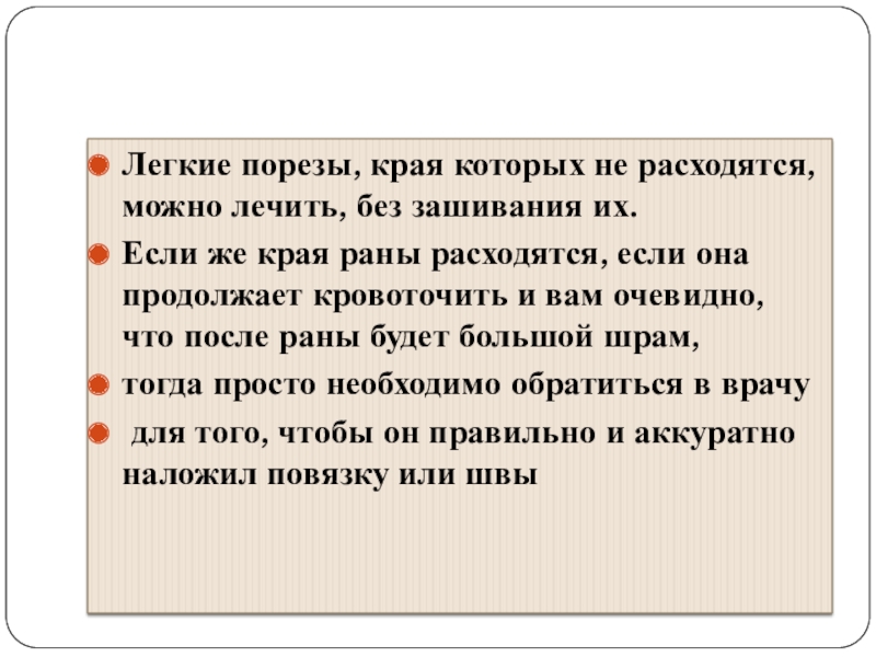Слайд 7Легкие порезы, края которых не расходятся, можно лечить, без зашивания их.