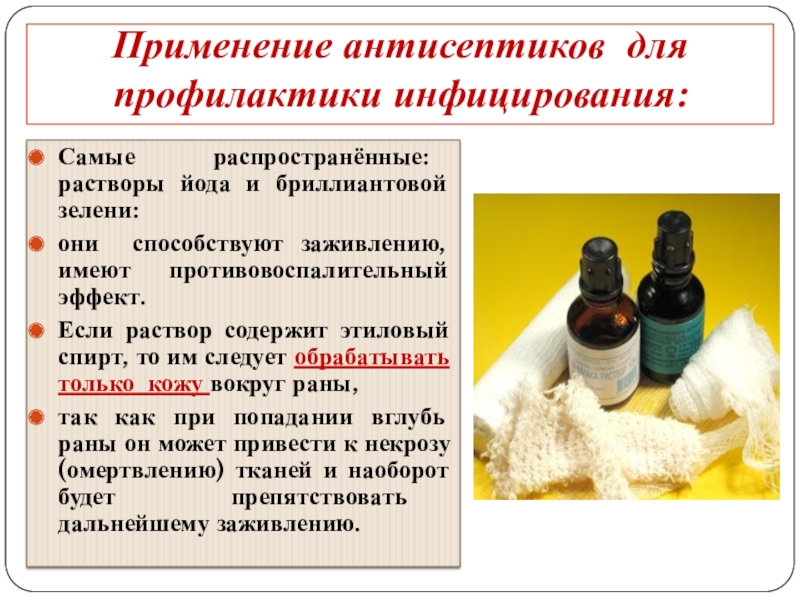 Слайд 15Применение антисептиков для профилактики инфицирования: