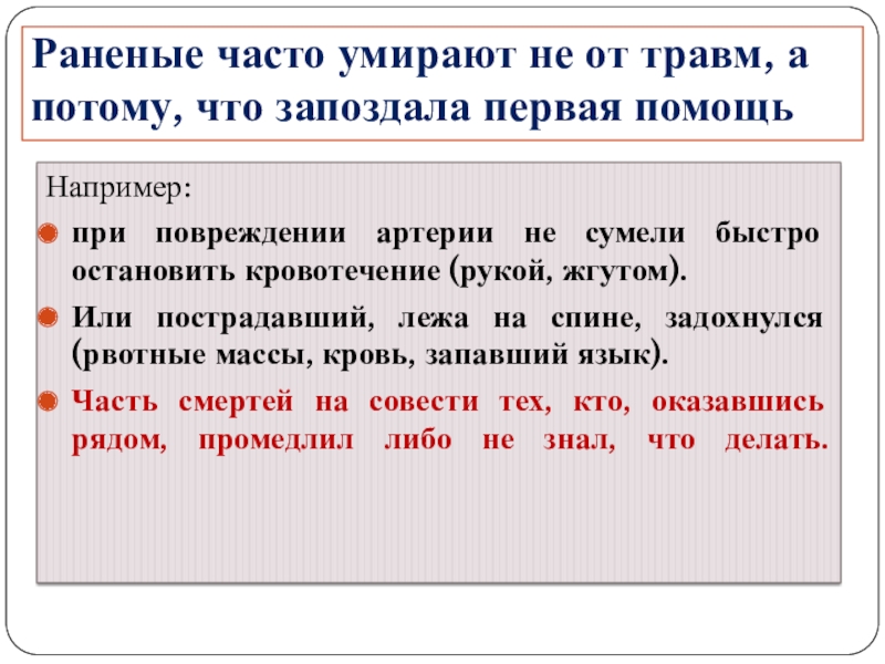 Слайд 4Раненые часто умирают не от травм, а потому, что запоздала первая