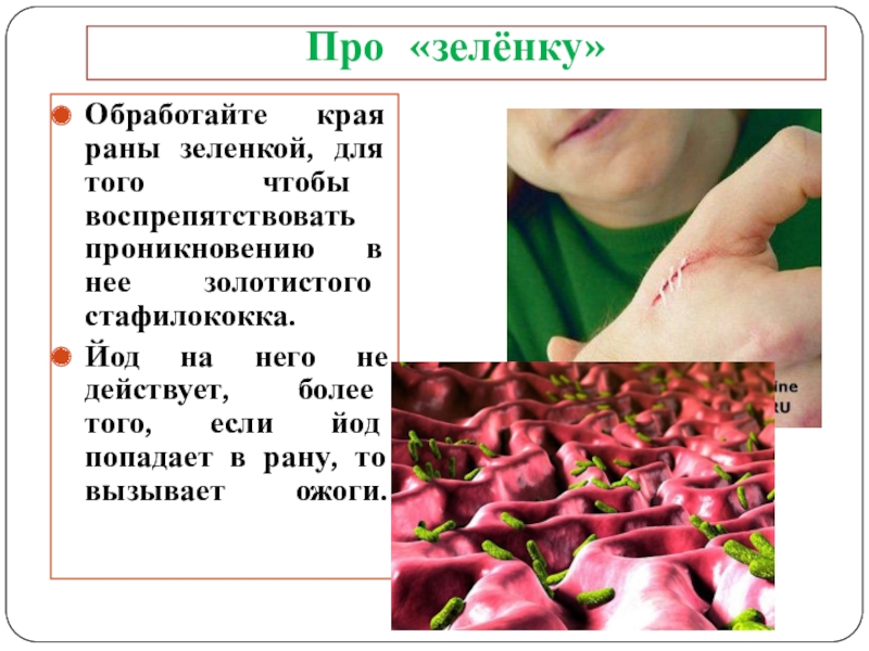 Обработайте края раны зеленкой, для того чтобы воспрепятствовать проникновению в