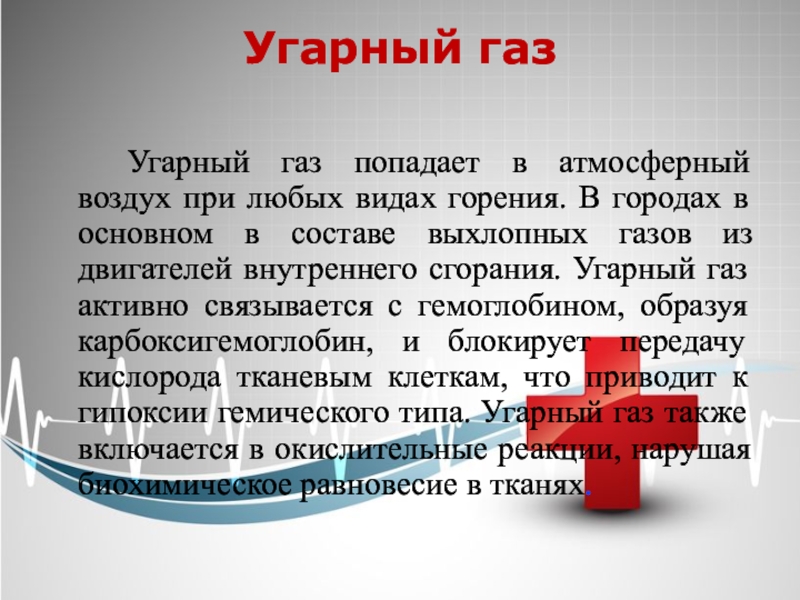 Угарный газ Угарный газ попадает в атмосферный воздух при любых видах горения. В городах в основном в составе выхлопных газов из двигателей внутреннего сгорания. Угарный газ активно связывается с гемоглобином, образуя карбоксигемоглобин, и блокирует передачу кислорода
