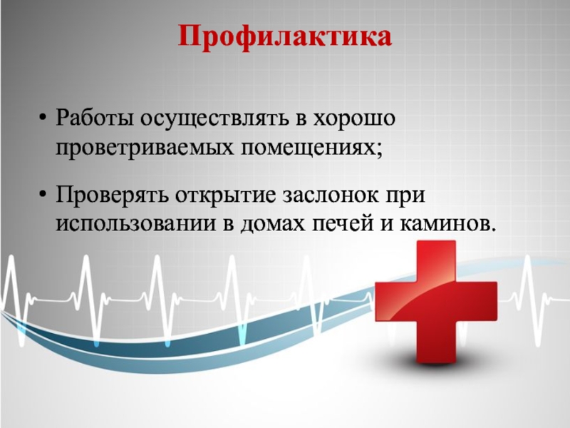 Профилактика Работы осуществлять в хорошо проветриваемых помещениях;Проверять открытие заслонок при использовании в домах печей и каминов.