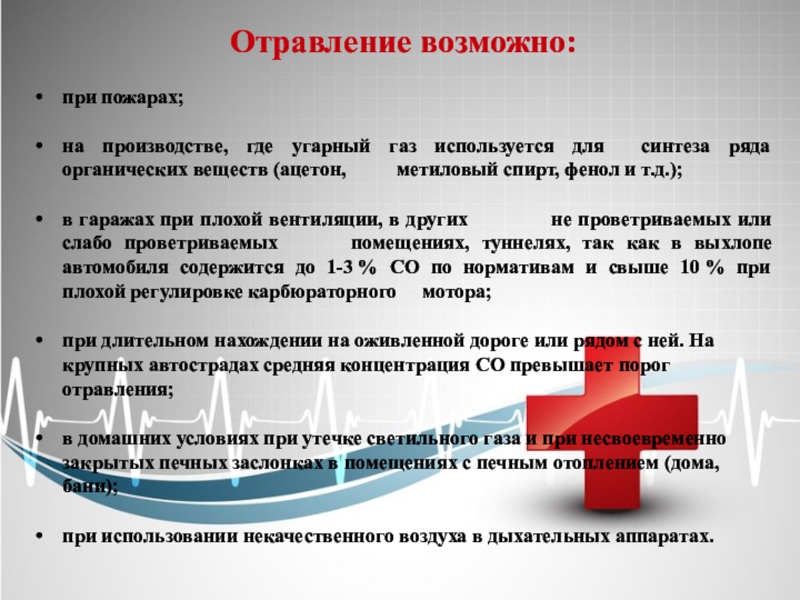 Отравление возможно:при пожарах;на производстве, где угарный газ используется для синтеза ряда органических веществ (ацетон,
