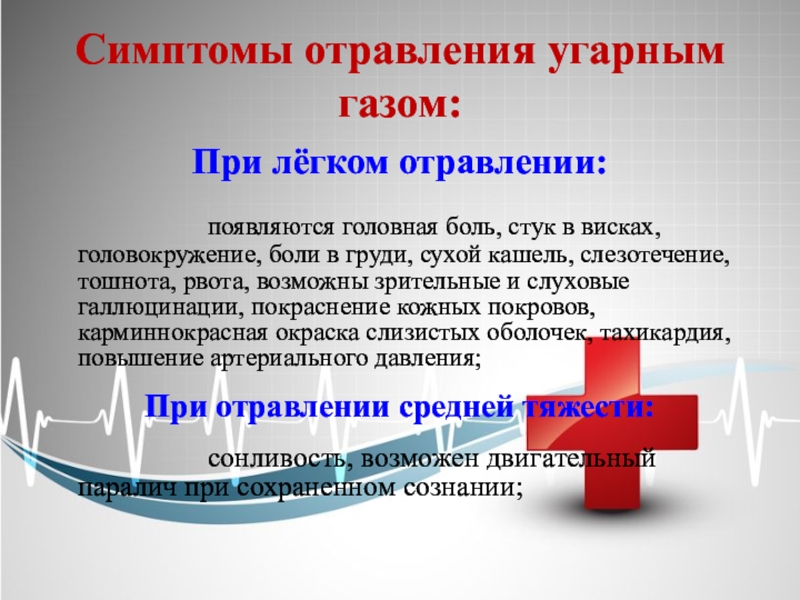 Симптомы отравления угарным газом:При лёгком отравлении: 				появляются головная боль, стук в висках, головокружение, боли в груди, сухой