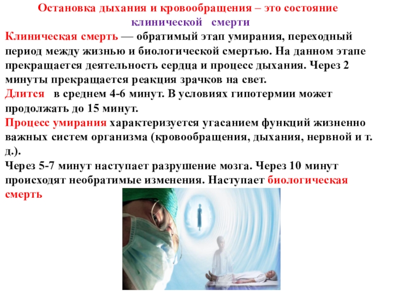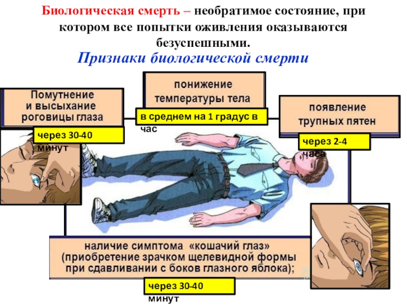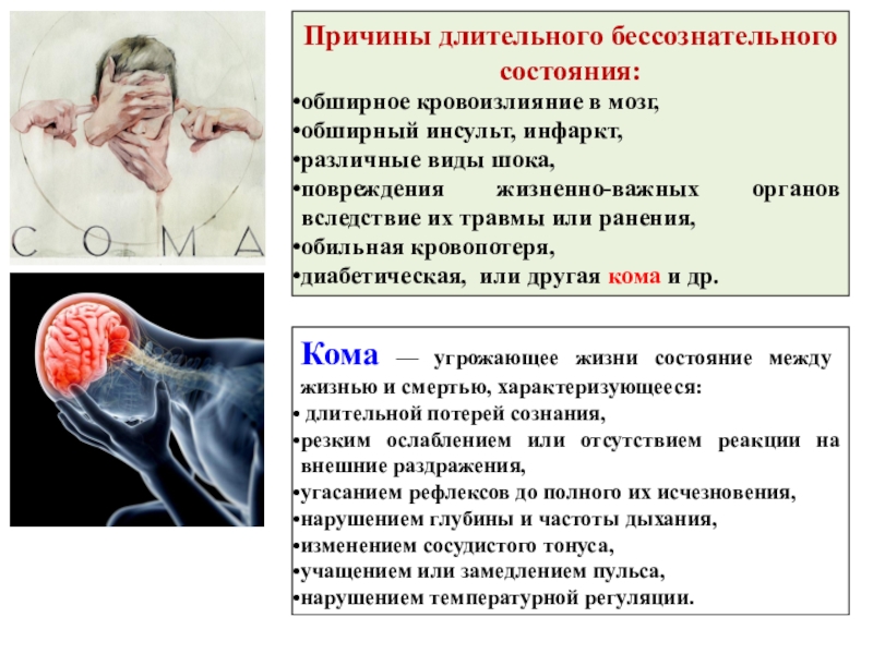 Причины: обширное кровоизлияние в мозг, инфаркт, различные виды шока, повреждения жизненно-важных орга-нов, обильная кровопотеря, диабети-ческая или другая кома и прочие