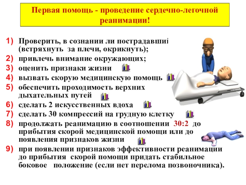 Необходимо контролировать пульс, дыхание - при необходимости провести сердечно-легочную реанимацию.