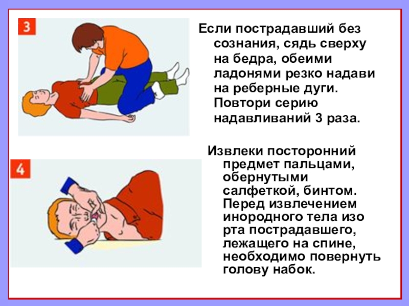 Извлеки посторонний предмет пальцами, обернутыми салфеткой, бинтом. Перед извлечением инородного тела изо рта пострадавшего, лежащего на спине, необходимо повернуть голову набок.
