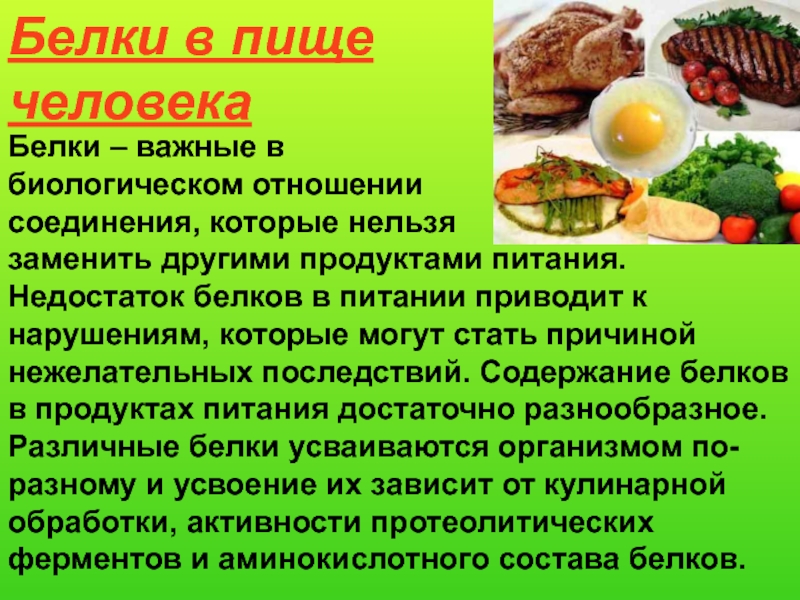 В питании человека мясо — источник белка. Это мышечные белки (миозин, актин, глобулин), содержащие все незаменимые аминокислоты, и неполноценные белки (коллаген).
