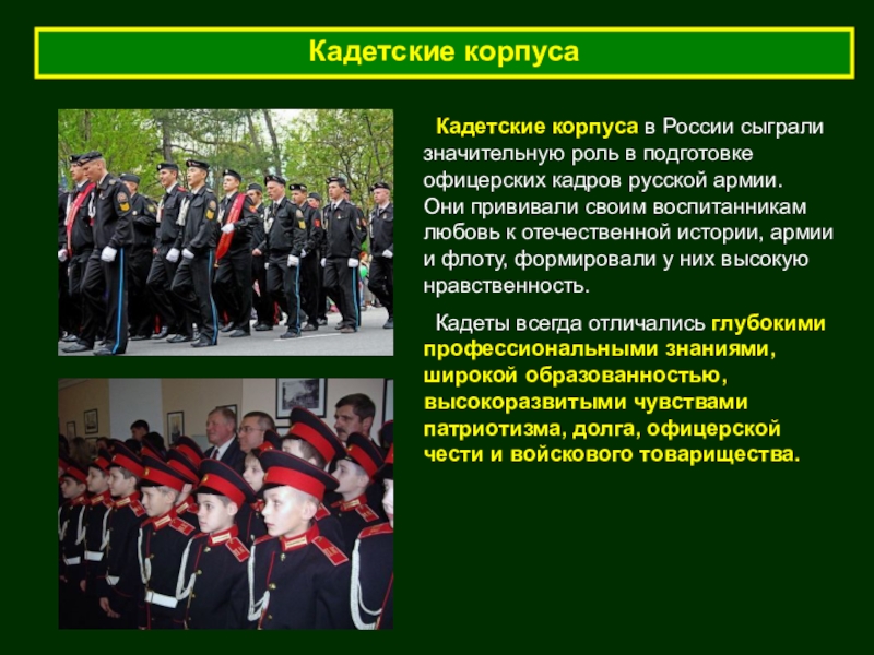 офицерских кадров русской армии. Они прививали своим воспитанникам любовь к отечественной истории, армии и флоту, формировали у них высокую нравственность.