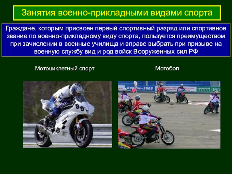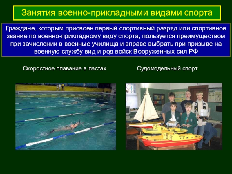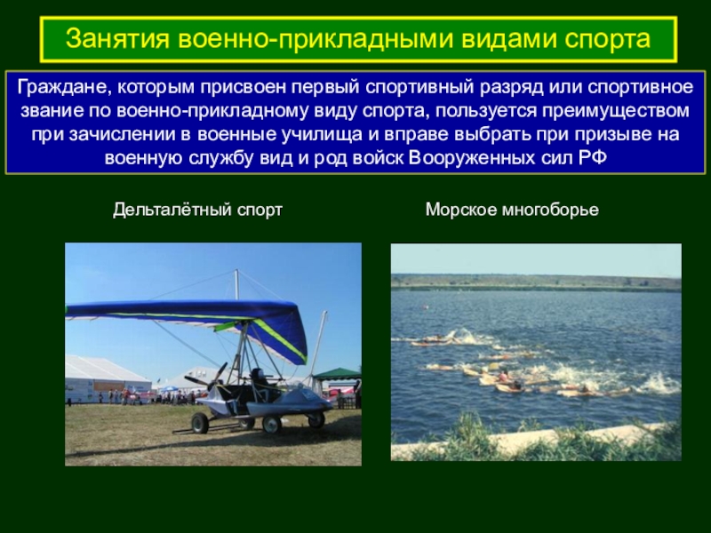Занятия военно-прикладными видами спортаГраждане, которым присвоен первый спортивный разряд или спортивное звание по военно-прикладному виду спорта, пользуется