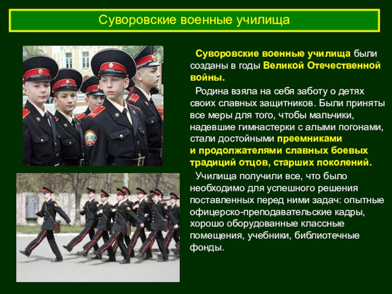 Суворовские военные училища Суворовские военные училища были созданы в годы Великой Отечественной войны.  Родина взяла на себя
