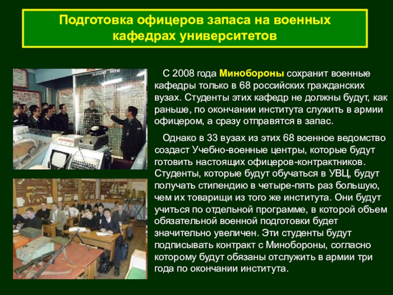 Подготовка офицеров запаса на военных кафедрах университетов  С 2008 года Минобороны сохранит военные кафедры только в