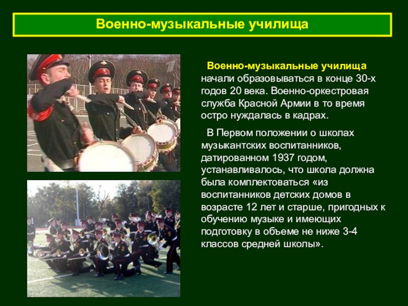 Военно-музыкальные училища Военно-музыкальные училища начали образовываться в конце 30-х годов 20 века. Военно-оркестровая служба Красной Армии в