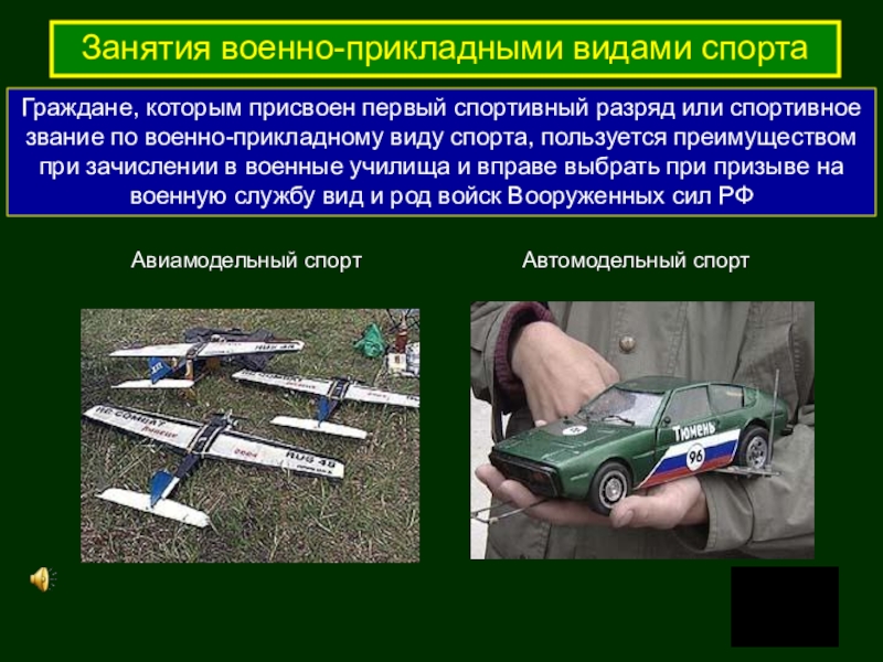 звание по военно-прикладному виду спорта, пользуется преимуществом при зачислении в военные училища и вправе выбрать при призыве на военную службу вид и род войск Вооруженных сил РФ