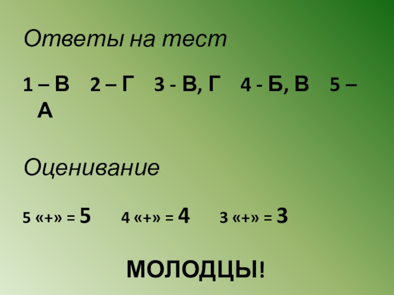 Ответы на тест1 – В  2 – Г  3 - В, Г  4 -