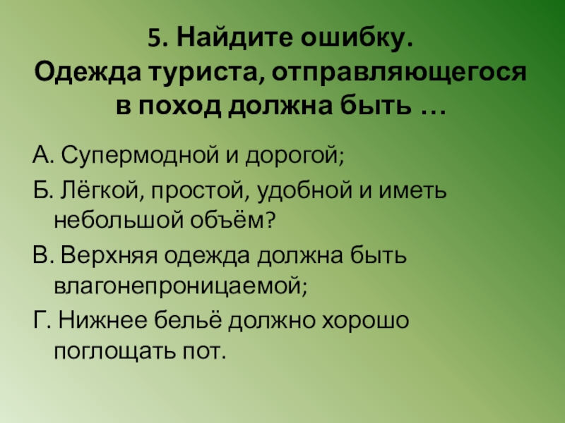 5. Найдите ошибку. Одежда туриста, отправляющегося в поход должна быть …А. Супермодной и дорогой;Б. Лёгкой, простой, удобной
