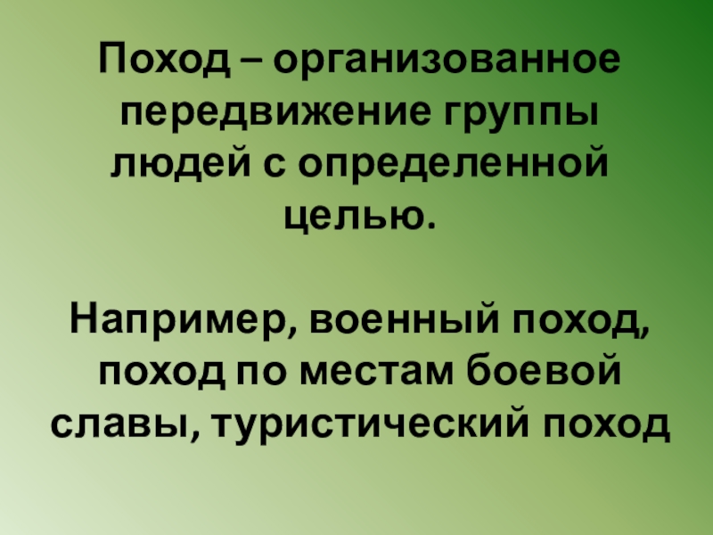 Поход – организованное передвижение группы людей с определенной целью.   Например, военный поход, поход по местам