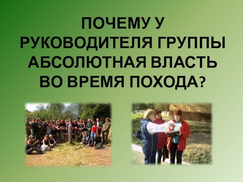 Слайд 7ПОЧЕМУ У РУКОВОДИТЕЛЯ ГРУППЫ АБСОЛЮТНАЯ ВЛАСТЬ ВО ВРЕМЯ ПОХОДА?