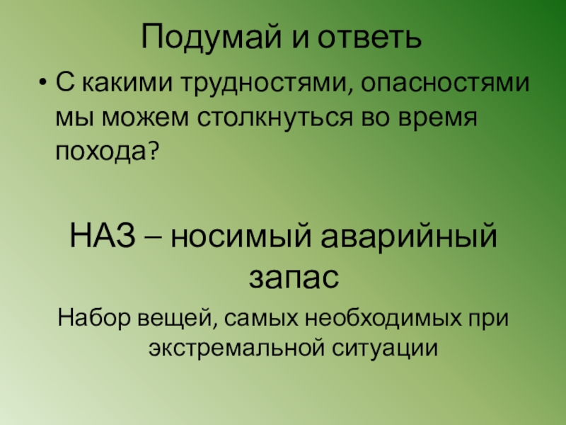 Подумай и ответьС какими трудностями, опасностями мы можем столкнуться во время похода?НАЗ – носимый аварийный запасНабор вещей,