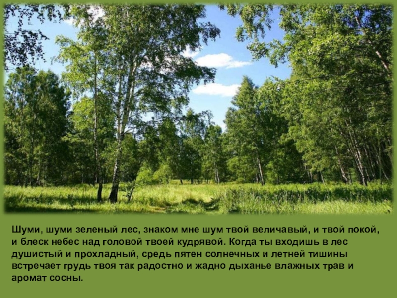Слайд 2Шуми, шуми зеленый лес, знаком мне шум твой величавый, и твой