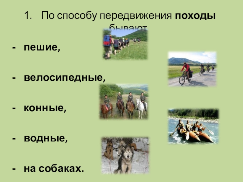 По способу передвижения походы бываютпешие,велосипедные,конные,водные,на собаках.