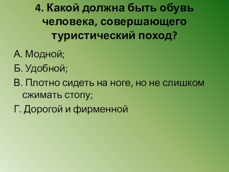 4. Какой должна быть обувь человека, совершающего туристический поход?А. Модной;Б. Удобной;В. Плотно сидеть на ноге, но не