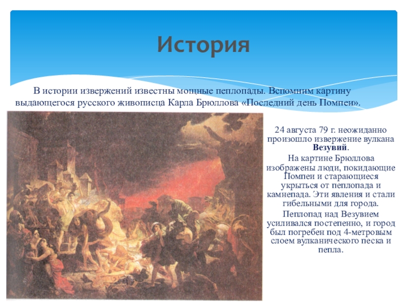 В истории извержений известны мощные пеплопады. Вспомним картину выдающегося русского живописца Карла Брюллова «Последний день Помпеи».