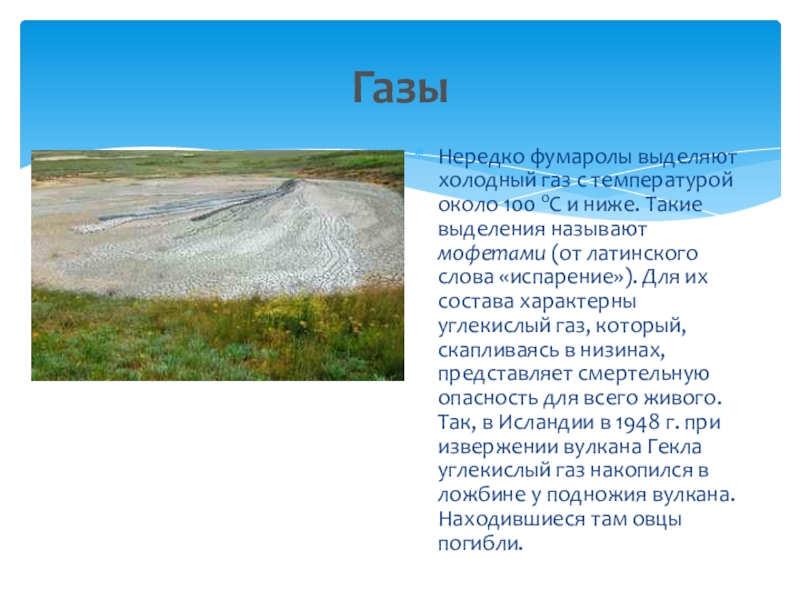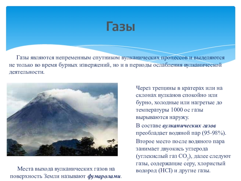 Газы являются непременным спутником вулканических процессов и выделяются не только во время бурных извержений, но и в периоды ослабления вулканической деятельности.