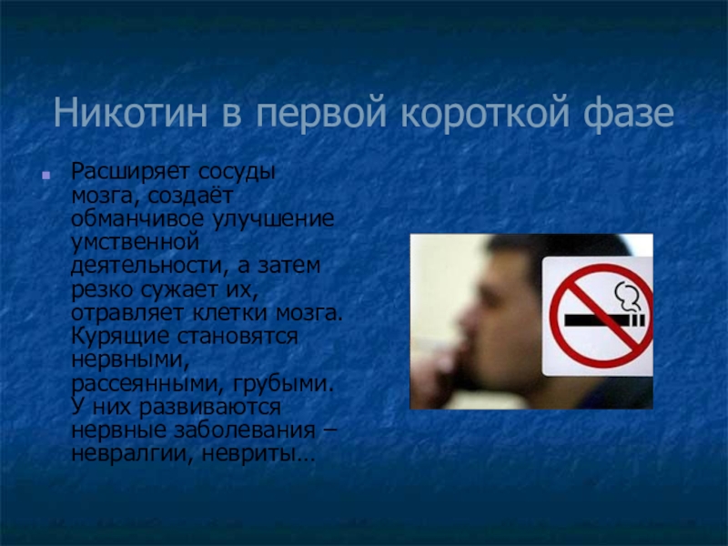 деятельности, а затем резко сужает их, отравляет клетки мозга. Курящие становятся нервными, рассеянными, грубыми. У них развиваются нервные заболевания – невралгии, невриты…