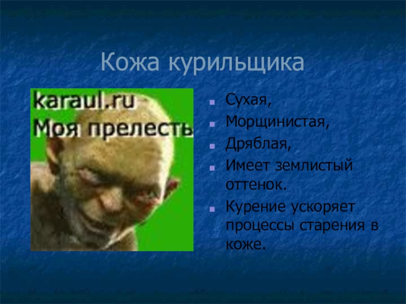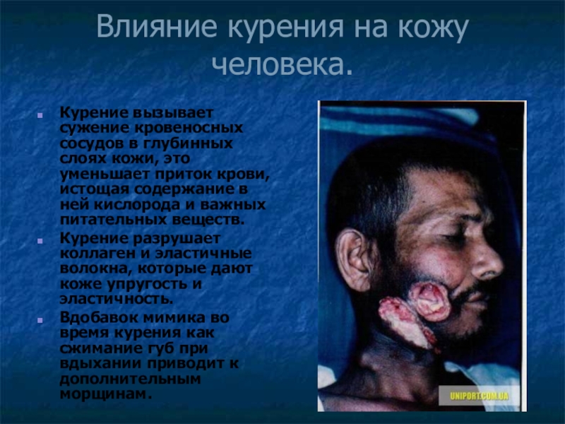 Курение разрушает коллаген и эластичные волокна, которые дают коже упругость и эластичность.