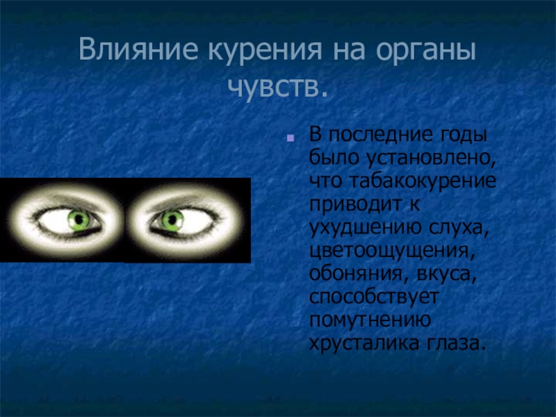 приводит к ухудшению слуха, цветоощущения, обоняния, вкуса, способствует помутнению хрусталика глаза.