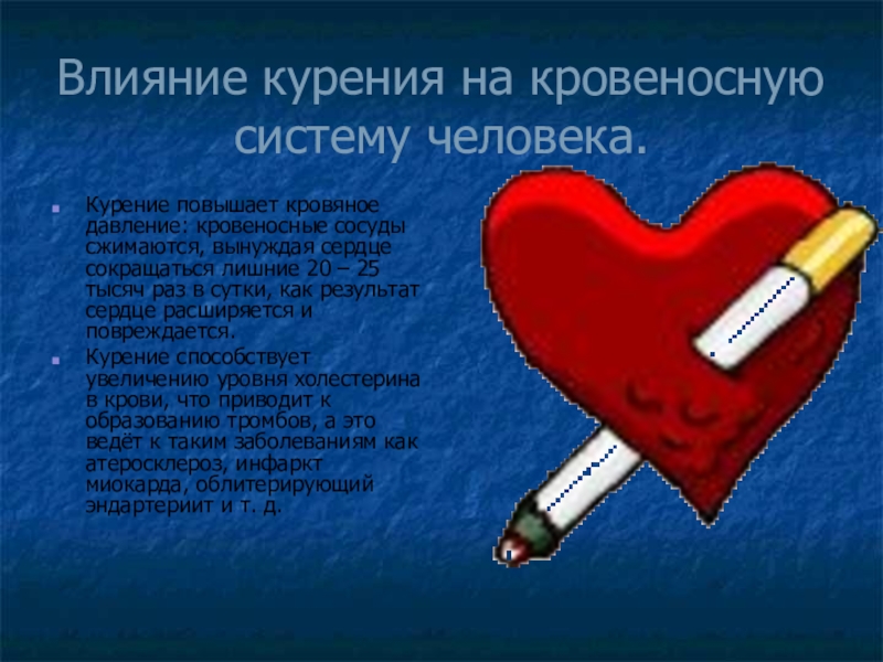Курение способствует увеличению уровня холестерина в крови, что приводит к образованию тромбов, а это ведёт к таким заболеваниям как атеросклероз, инфаркт миокарда, облитерирующий эндартериит и т. д.