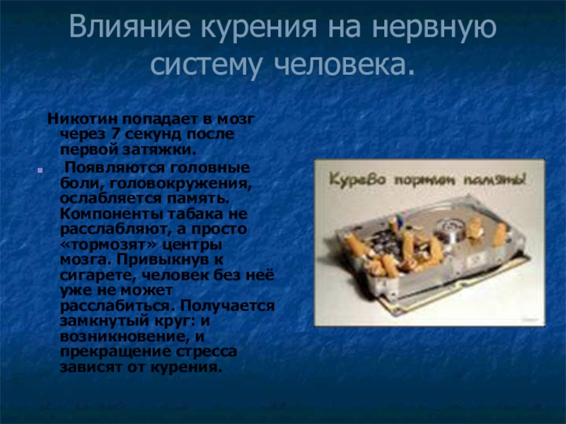Появляются головные боли, головокружения, ослабляется память. Компоненты табака не расслабляют, а просто «тормозят» центры мозга. Привыкнув к сигарете, человек без неё уже не может расслабиться. Получается замкнутый круг: и возникновение, и прекращение стресса зависят от курения.