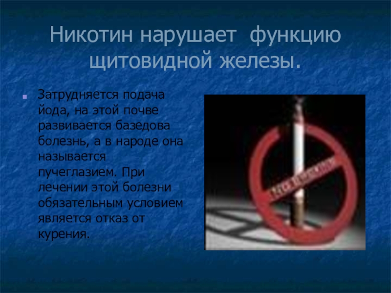 Слайд 6Никотин нарушает функцию щитовидной железы.