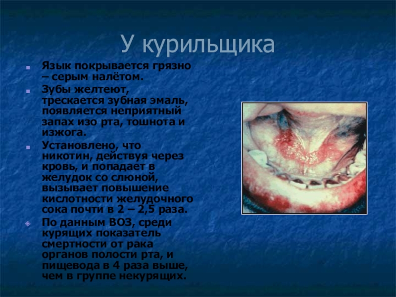 По данным ВОЗ, среди курящих показатель смертности от рака органов полости рта, и пищевода в 4 раза выше, чем в группе некурящих.