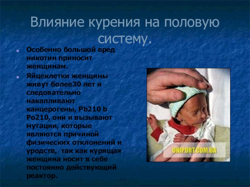 живут более30 лет и следовательно накапливают канцерогены, Pb210 b Po210, они и вызывают мутации, которые являются причиной физических отклонений и уродств, так как курящая женщина носит в себе постоянно действующий реактор.
