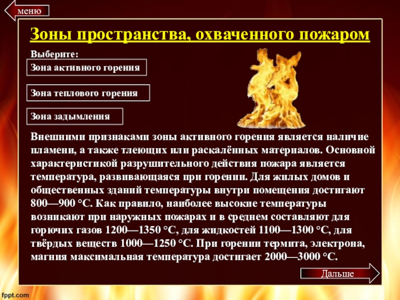 Основной характеристикой разрушительного действия пожара является температура, развивающаяся при горении. Для жилых домов и общественных зданий температуры внутри помещения достигают 800—900 °C. Как правило, наиболее высокие температуры возникают при наружных пожарах и в среднем составляют: